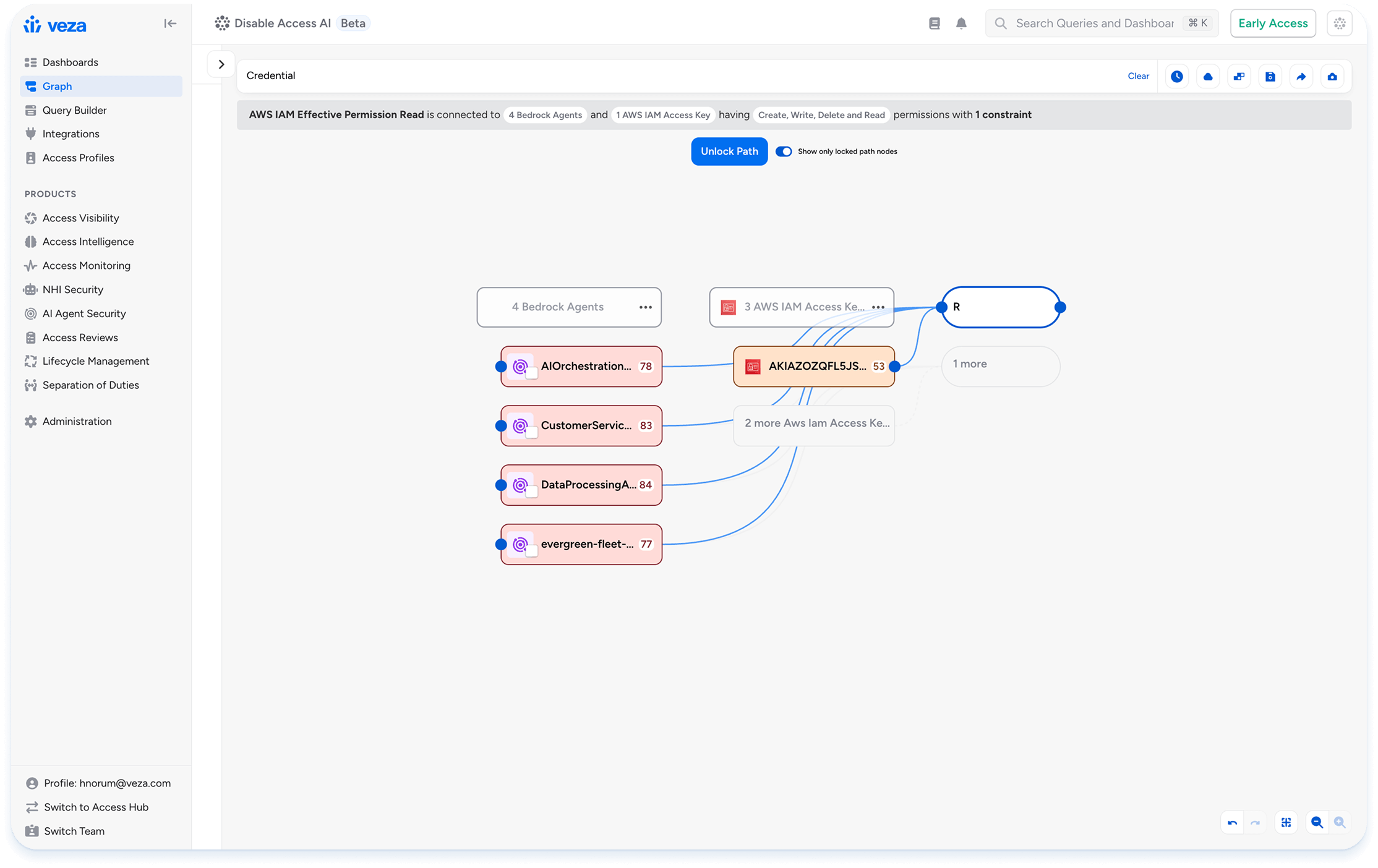 With Veza Access Agents, we have combined the power of the Veza Access Graph with a set of purpose-built AI Agents to automate complex identity security and access governance tasks for organizations, at scale. Leveraging AWS Bedrock, Veza ensures enterprise-grade security and compliance for its AI agents. For specific tasks, Veza Access Agents selects the optimal model (Claude, Opus, Sonnet), and delivers quick responses or deep reasoning without compromising quality or correctness.
