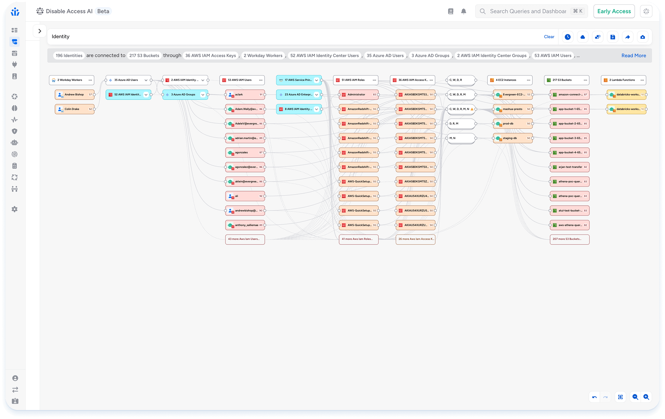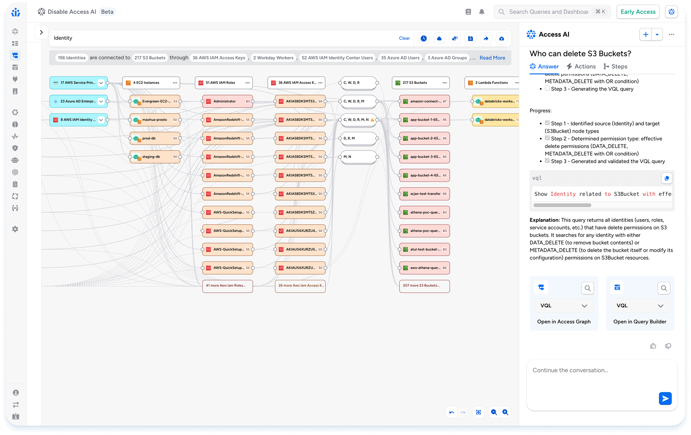 The Veza Access Search Agent takes the natural language prompts, applies deep reasoning, and dynamically visualizes complex permission relationships and entitlements for all identities. If a security engineer wants to know which identities have the potential to delete or modify S3 buckets, the Access Search Agent searches for risky access paths and entitlements across hybrid clouds and SaaS applications, and visualizes the blast radius in Access Graph. Veza gives the flexibility to visualize the information in Access Graph or Query Builder. In short, the Access Search Agent enables your security, compliance and IAM teams to visualize risky access paths to your data with simple prompts.