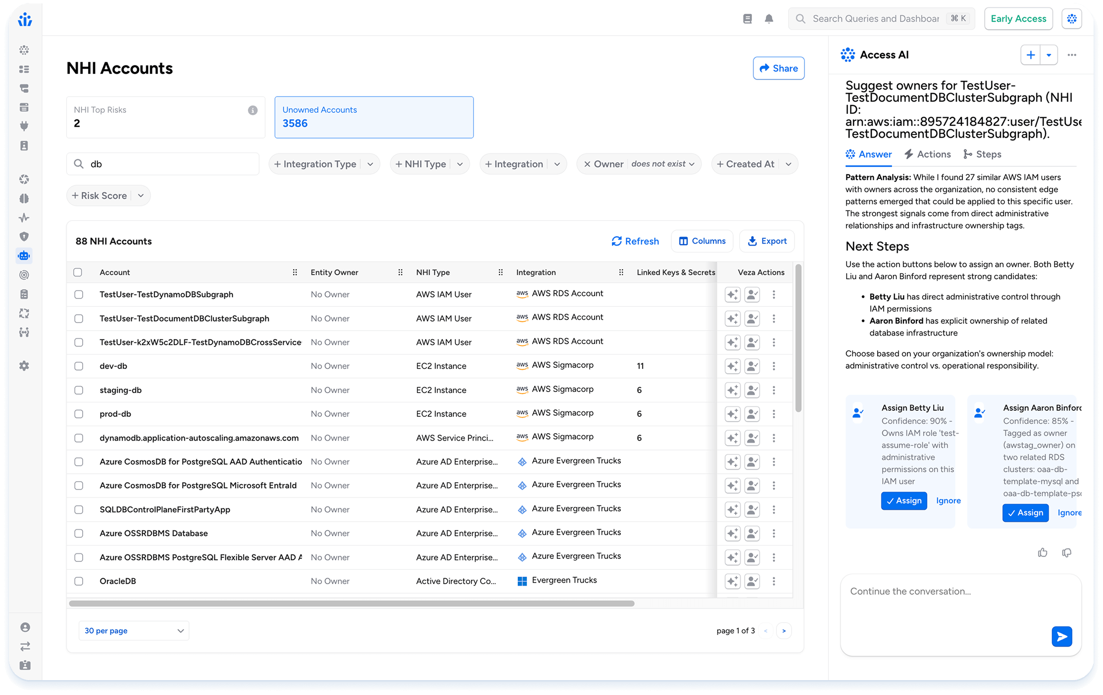 The Veza AI Agent Security provides deep visibility into every AI agent identity and establishes robust AI-agent-to-human ownership for accountability and governance. Veza now makes it easier to combat ‘shadow AI’ by automatically mapping unmanaged AI agent identities and NHIs to responsible human owners. When a developer spins up an AI agent with broad access permissions and later moves to a different department or role, Veza flags this orphaned agent identity and suggests possible human owners that can be mapped to this agent identity, tightening AI security posture and governance.