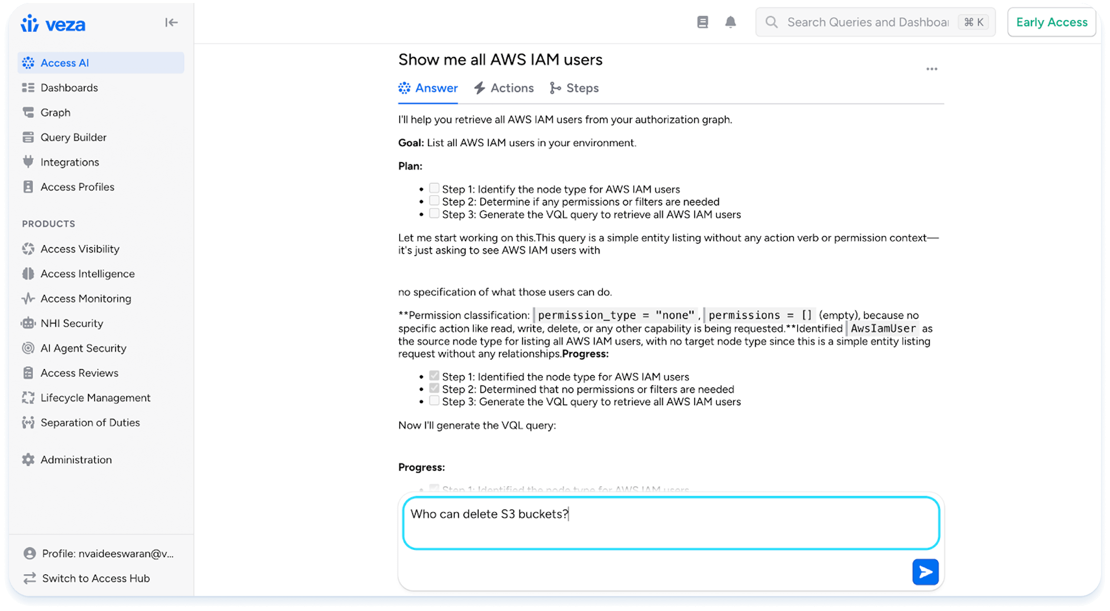 Given the complexity of the identity infrastructure, it takes hours or even days for security and IAM teams connect the dots between identities, permissions and risks with manual queries. The Veza Prompt Agent provides a conversational, natural language interface, allowing teams to quickly surface insights and hidden risks across human, non-human and AI agent identities. The Veza Prompt Agent empowers teams to audit or gain insights into identities with hidden administrative privileges, dormant accounts that can access sensitive data, and many more. It’s as simple as asking, ‘show me all AWS IAM users’, and double-clicking with follow-up questions, ‘Who can delete S3 buckets?– drastically reducing the time to get answers, from days or weeks, to just minutes.