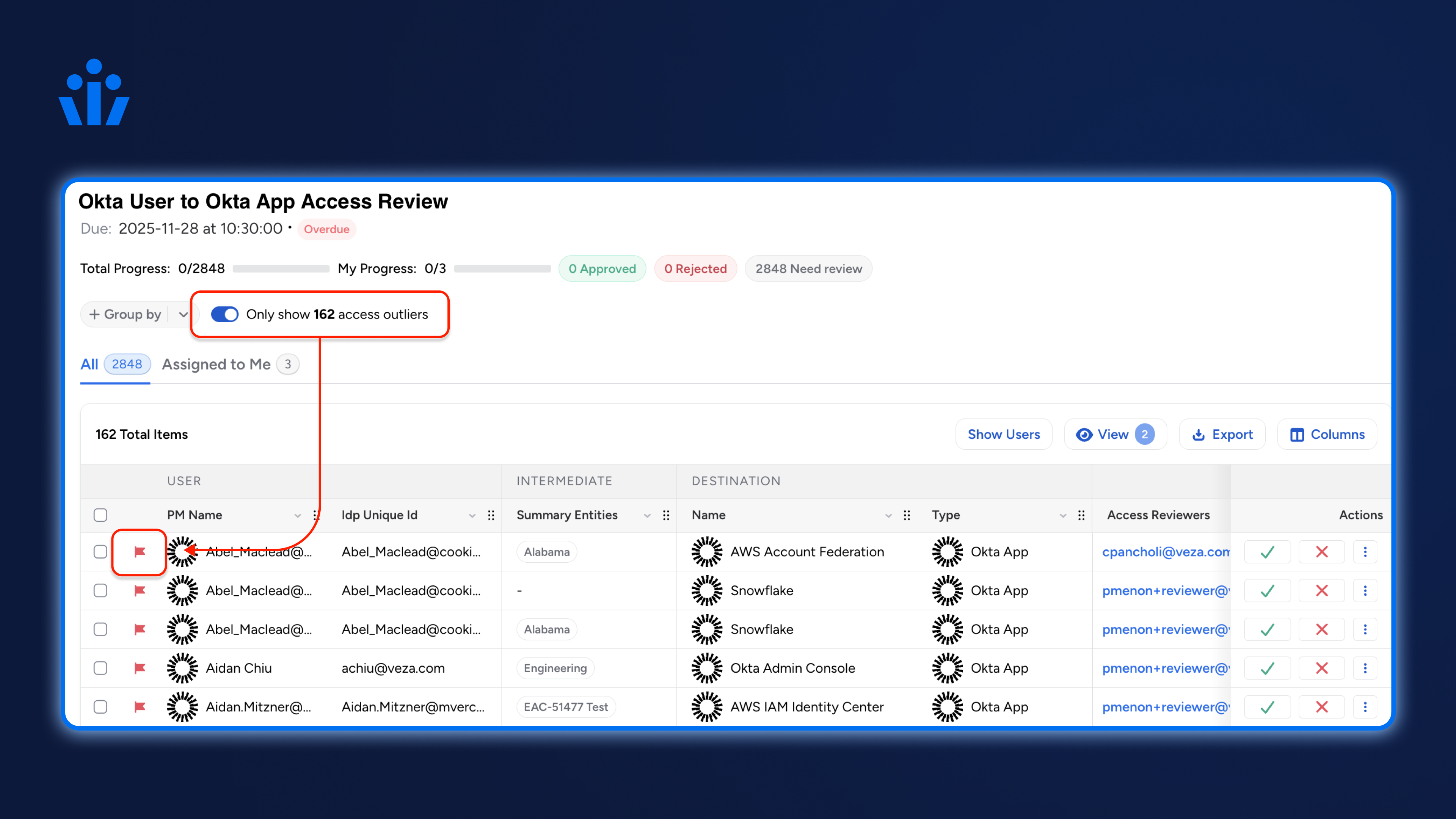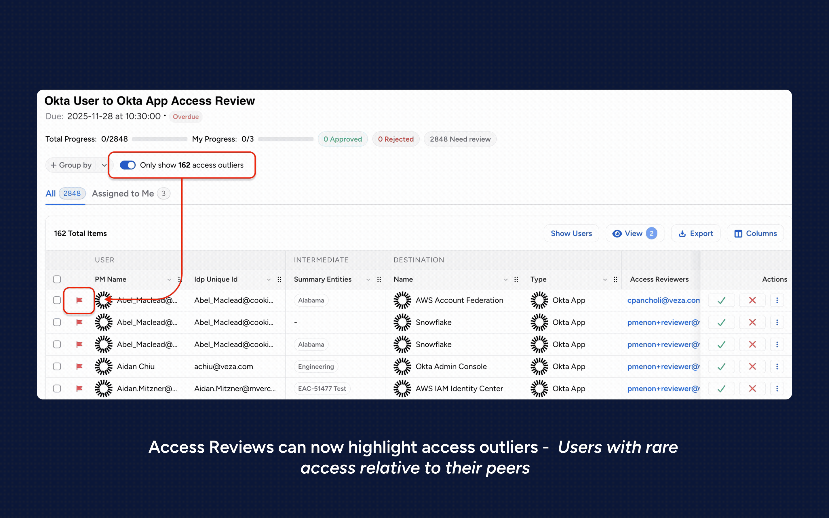 2. Major risk-based review improvements: Now includes support for Veza’s new Risk Score 2.0 algorithm, drillable risk scores within access reviews allowing reviewers to see contributing access risk factors, and access outlier detection based on peer group analysis.