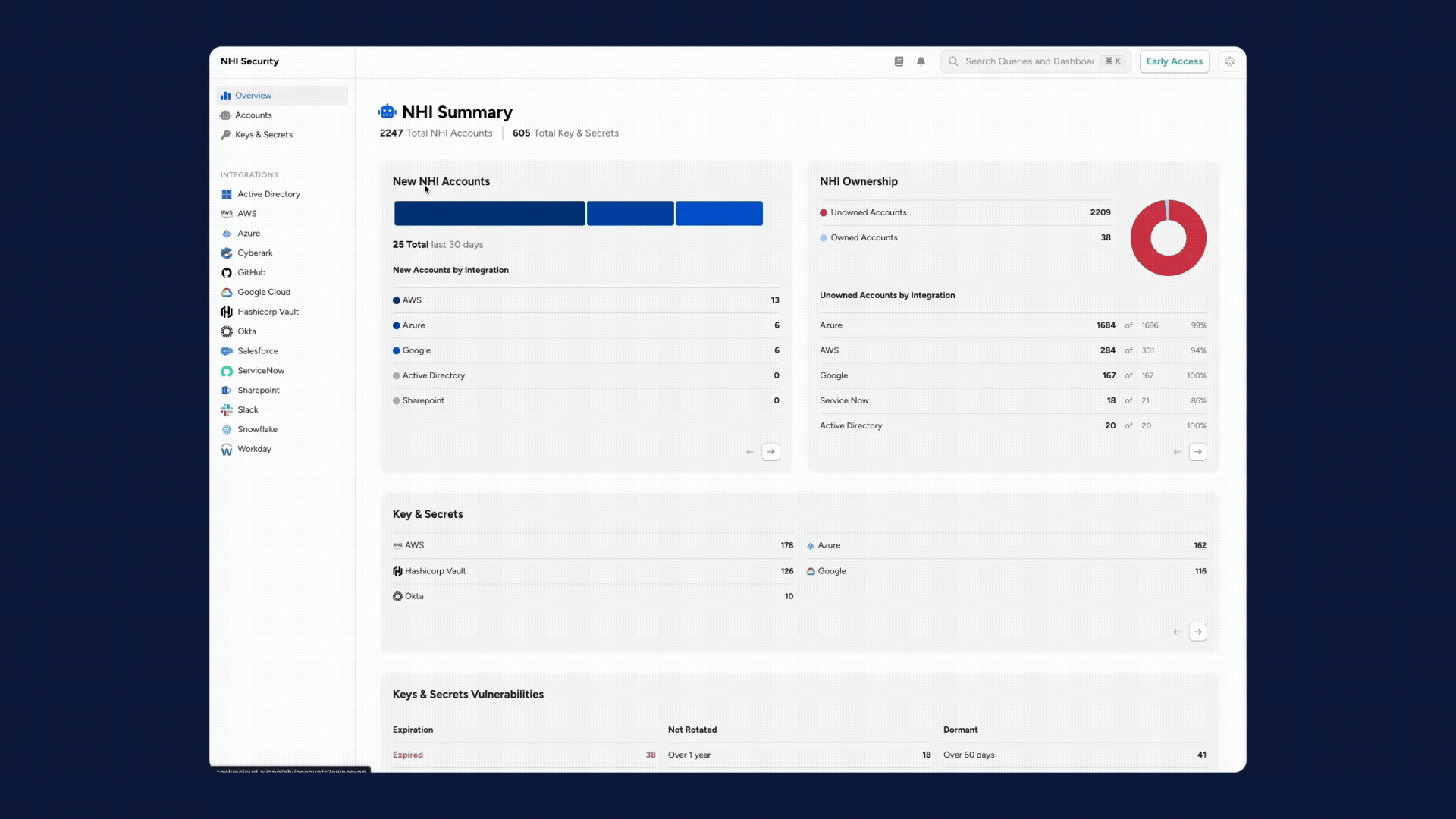 3. NHI Risk Dashboards: Pre-built, customizable dashboards that highlight critical risks like dormant keys, unrotated secrets, and overly permissive service accounts.