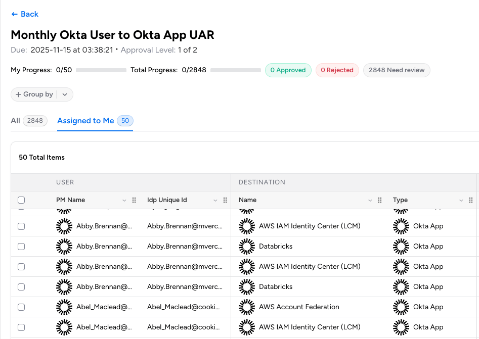 Once the user opens a specific review, they will see 2 tabs entitled “All” and “Assigned to Me”. These allow the user to quickly filter the review to show only the rows they need to make decisions on (“Assigned to Me”) vs. “All” rows. This combination of navigational aids greatly helps in surfacing what’s most pertinent and immediately actionable for a reviewer to address as soon as they log in to Veza.