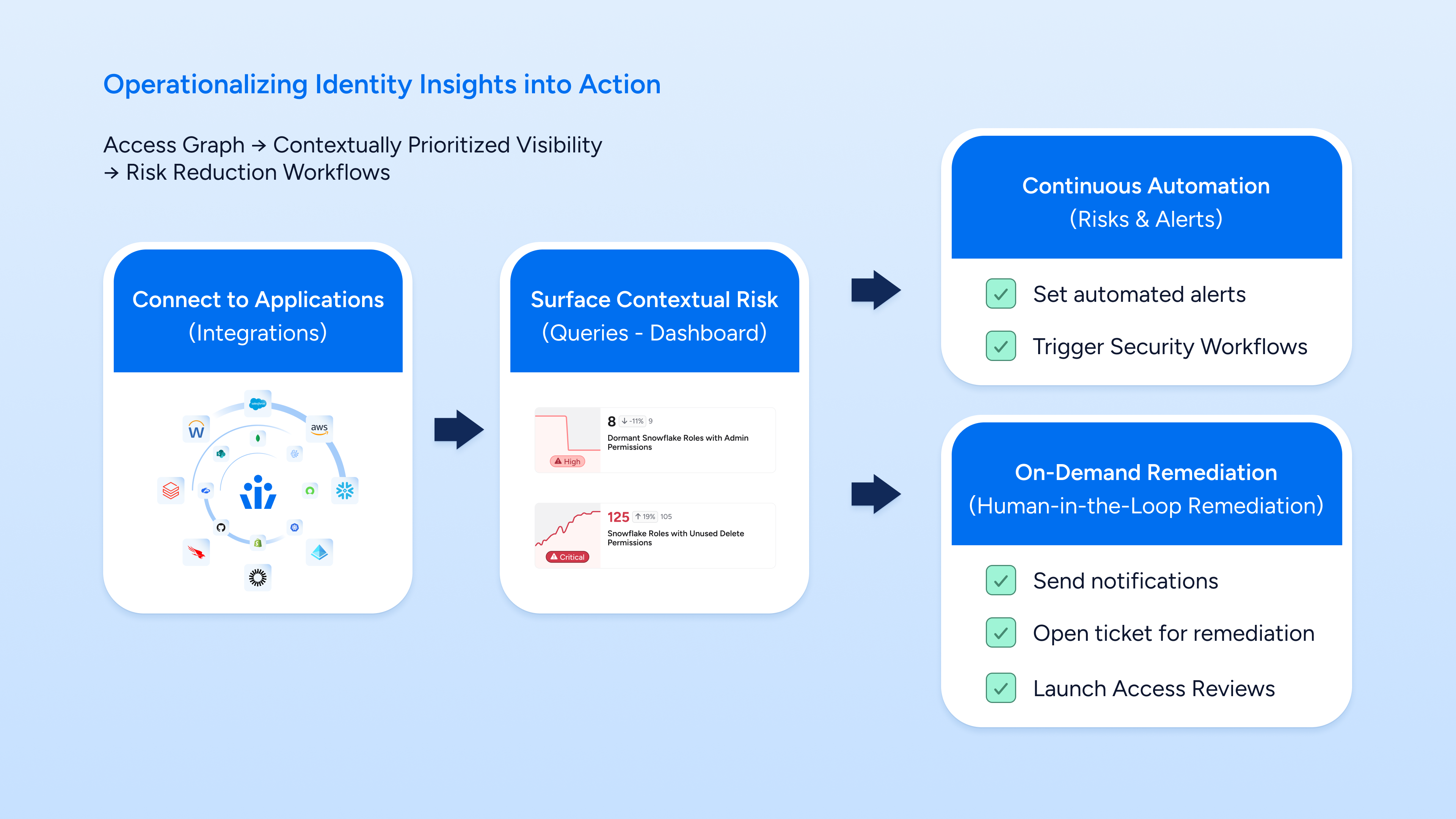 Figure 1: From Access Graph integrations → contextual risk queries → continuous automation and on-demand remediation