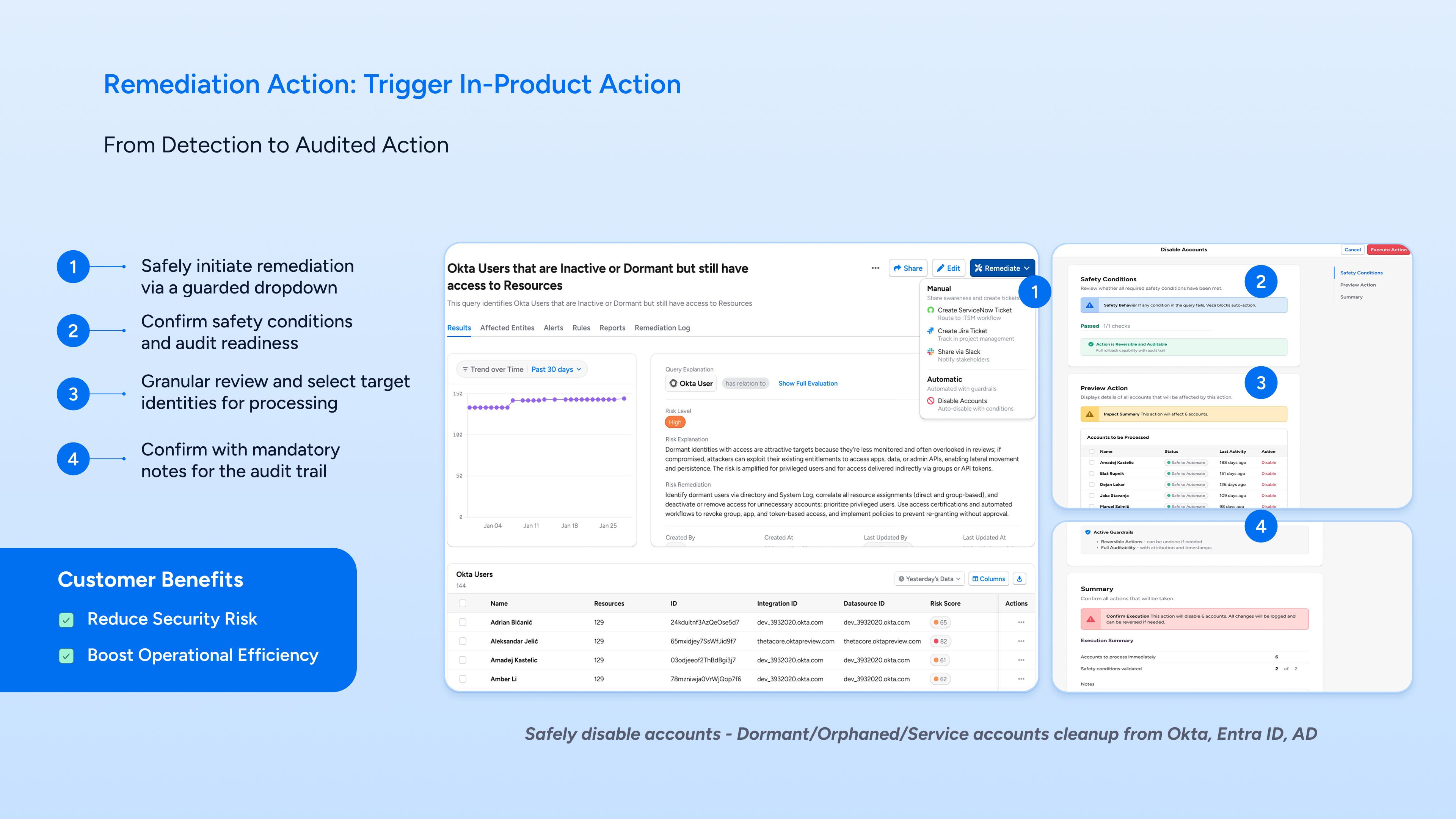 Disable Accounts sits at the end of a continuous workflow – connecting integrations, contextual risk surfacing, and now, direct remediation.