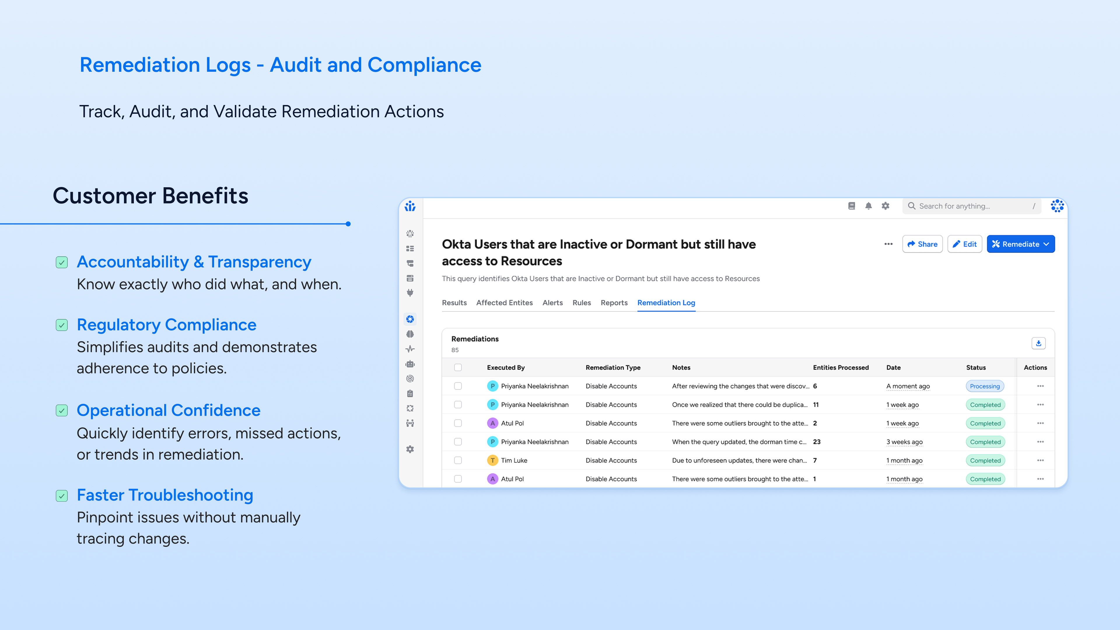 Figure 3: The Remediation Log — tracking who disabled what accounts, when, with notes and per-entity status