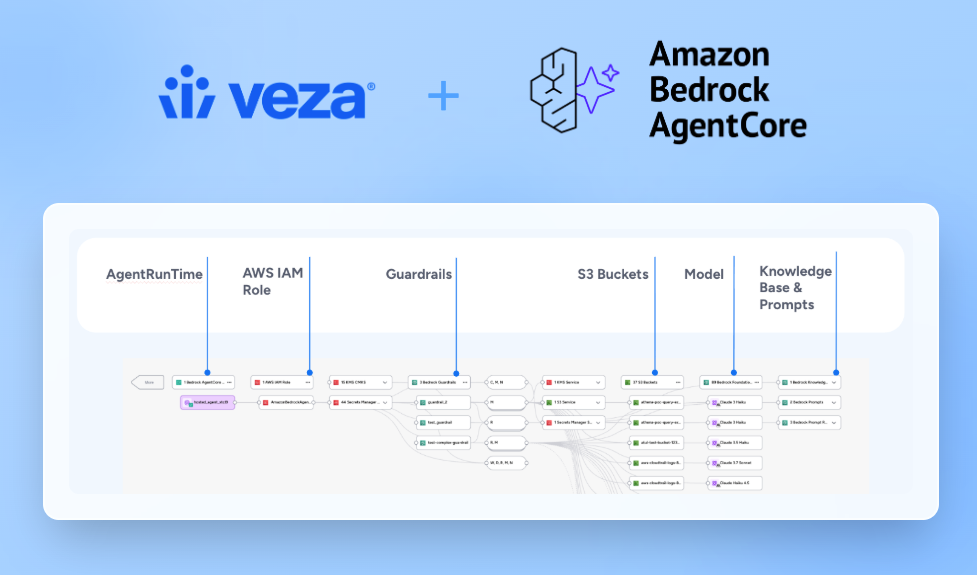 In many enterprises, the deployment of agents on Amazon Bedrock AgentCore involves multiple teams—developers building the agents, platform teams provisioning IAM roles, and data engineers configuring memory stores. Without a unified view, governing these complex interactions is nearly impossible. Today, Veza is closing that gap.
