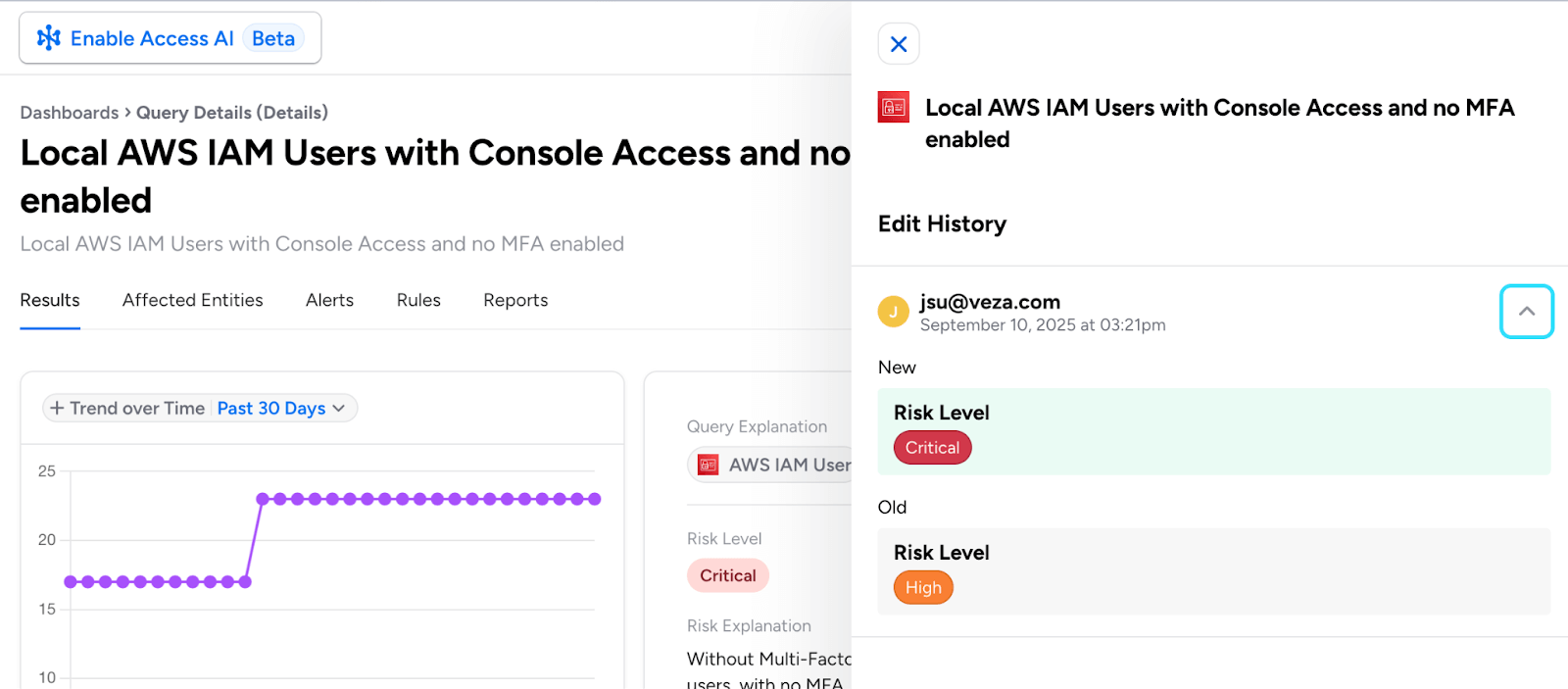 You can now track changes to your critical security queries with the new Query Diff View available in saved query details. This new feature provides a complete audit trail for Segregation of Duties (SoD) queries and other saved searches, showing before-and-after comparisons of query conditions, names, descriptions, and risk levels.