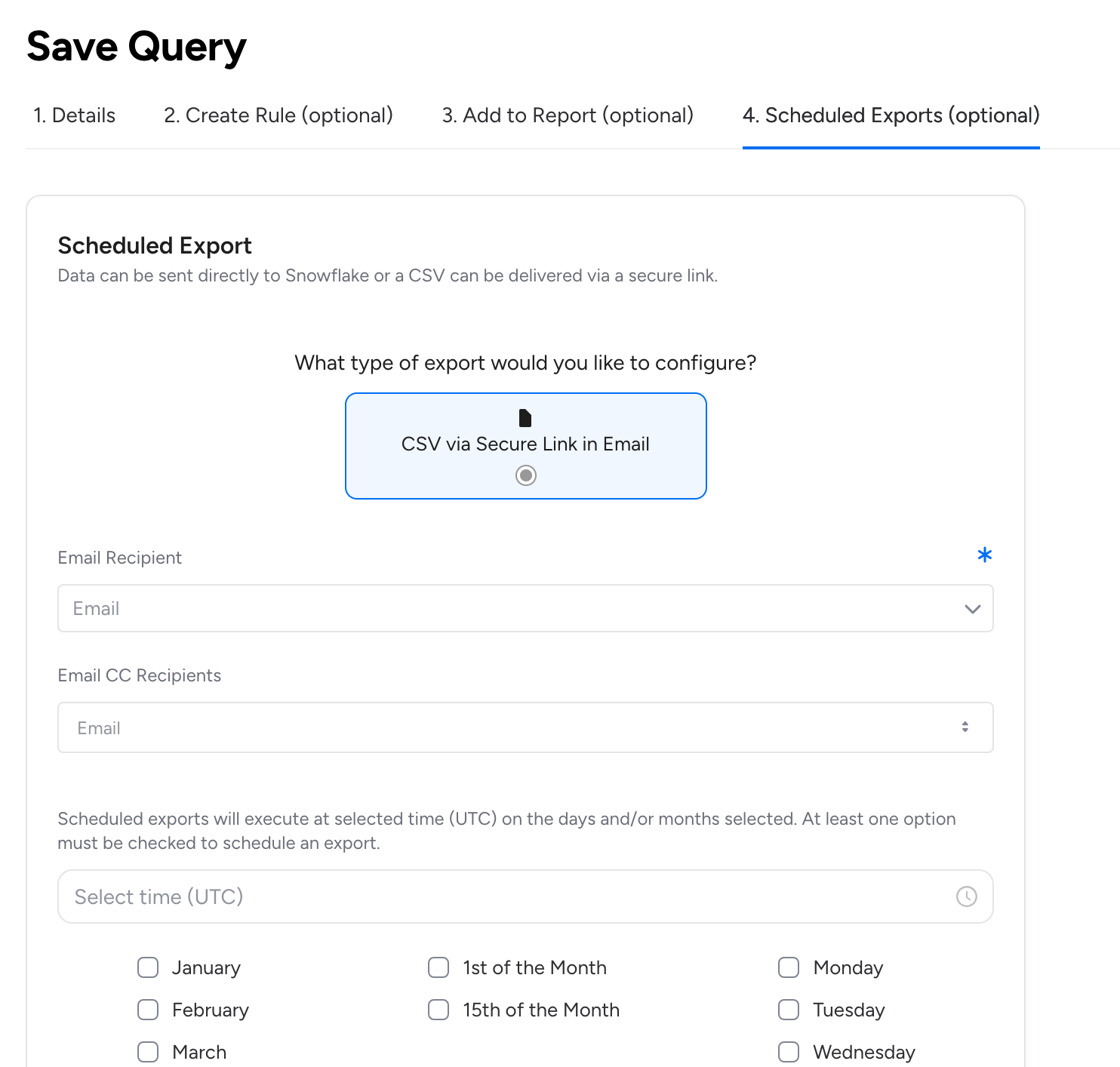 - Monthly Export Scheduling – Schedule query exports with granular monthly recurrence options.