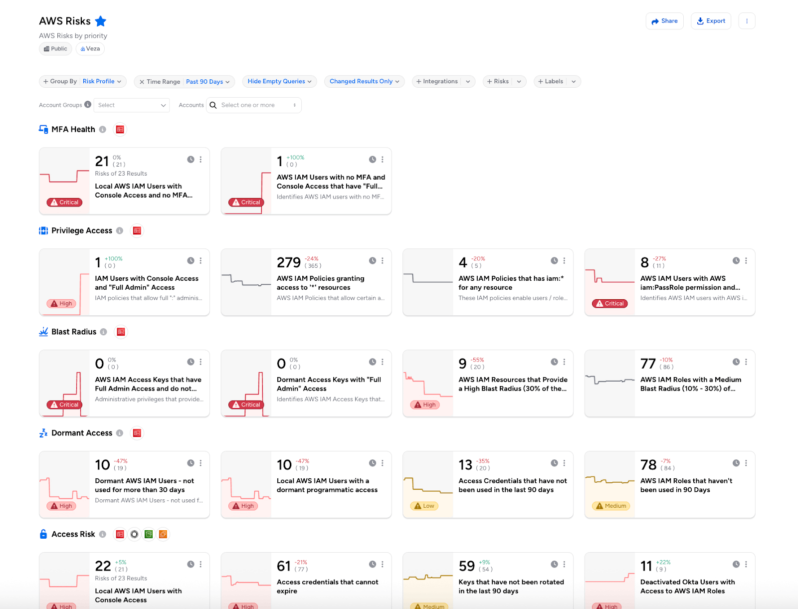 - Critical Risk Focus: Veza dashboards now automatically preselect the “Critical” risk level filter upon login, helping teams focus on the highest-priority security findings without manual configuration.