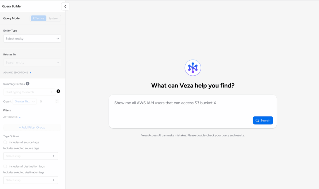 How to use it: Simply start typing natural language questions in the search field, and Access AI will construct the appropriate query with entity types and filters based on your input. For example, ask “Show me all AWS IAM users who can delete a particular S3 Bucket,” and Access AI will build the corresponding query.