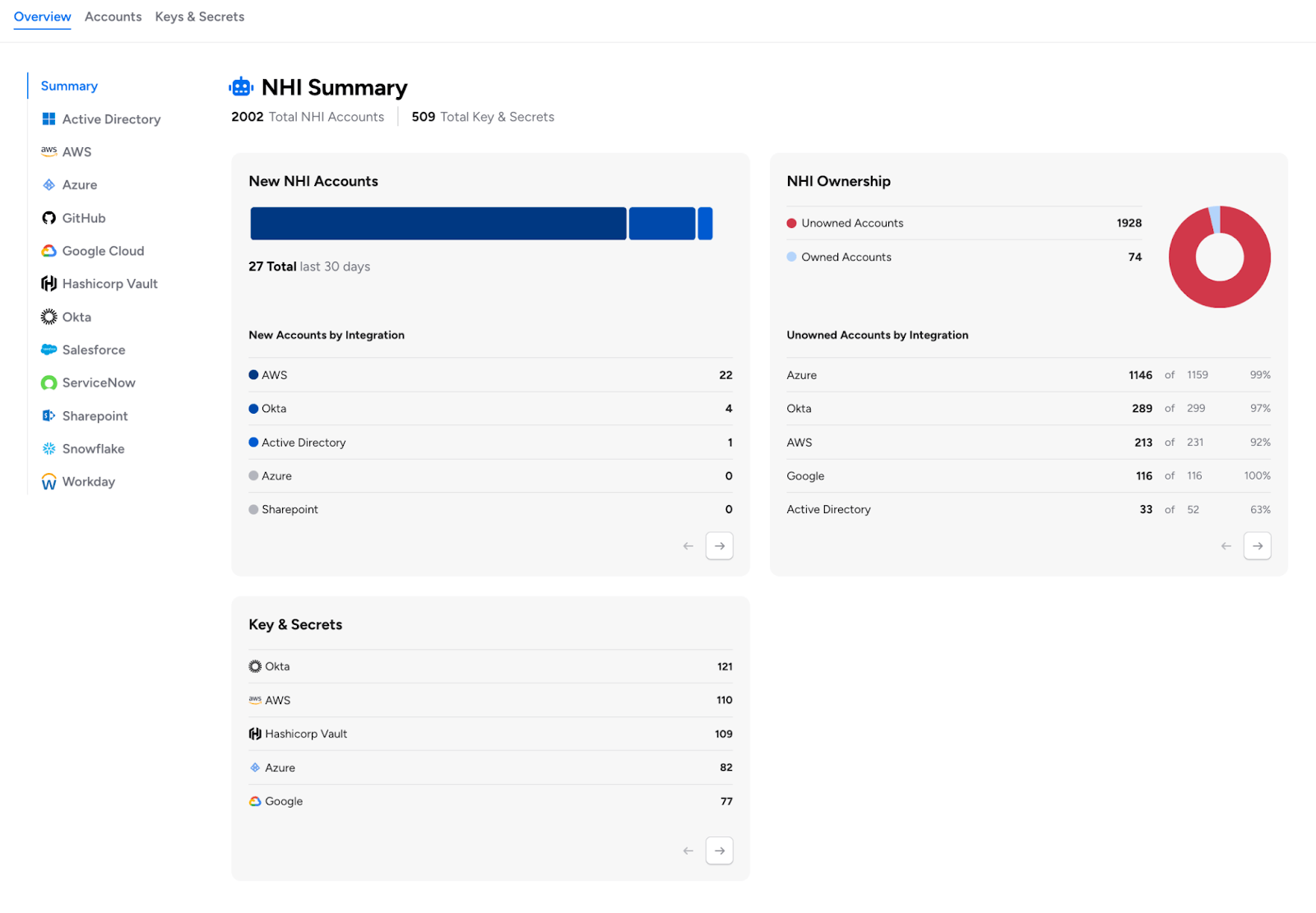 - New NHI Overview Dashboard – New landing page organizing NHI accounts by type and integration, with owner management, credential age tracking, and trend analysis.