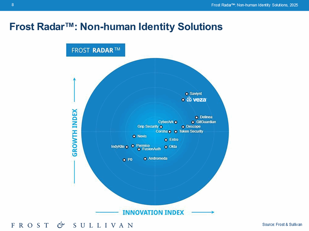 REDWOOD SHORES, Calif. – November 19, 2025Veza, the identity security company, has been named a Leader in the Frost Radar: Non-Human Identity Solutions, 2025, recognizing Veza as a leading innovator in the rapidly expanding non-human identity (NHI) market. Frost & Sullivan highlighted Veza’s architectural differentiation, enterprise traction, and first-of-its-kind Access Graph™ as key reasons it outpaces competitors.