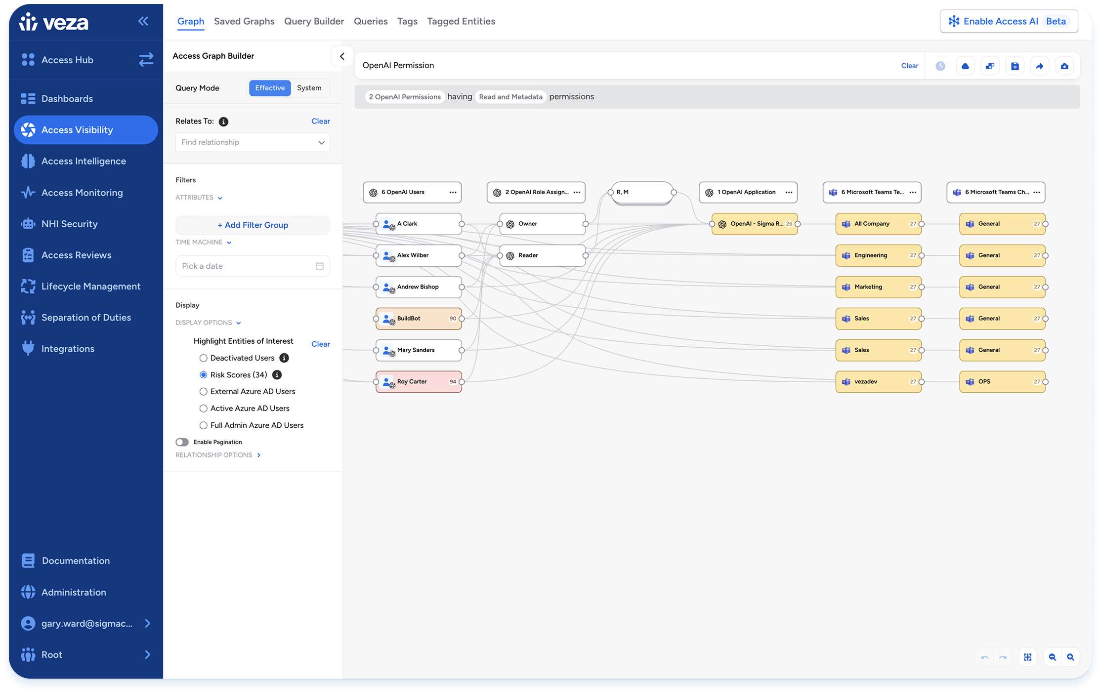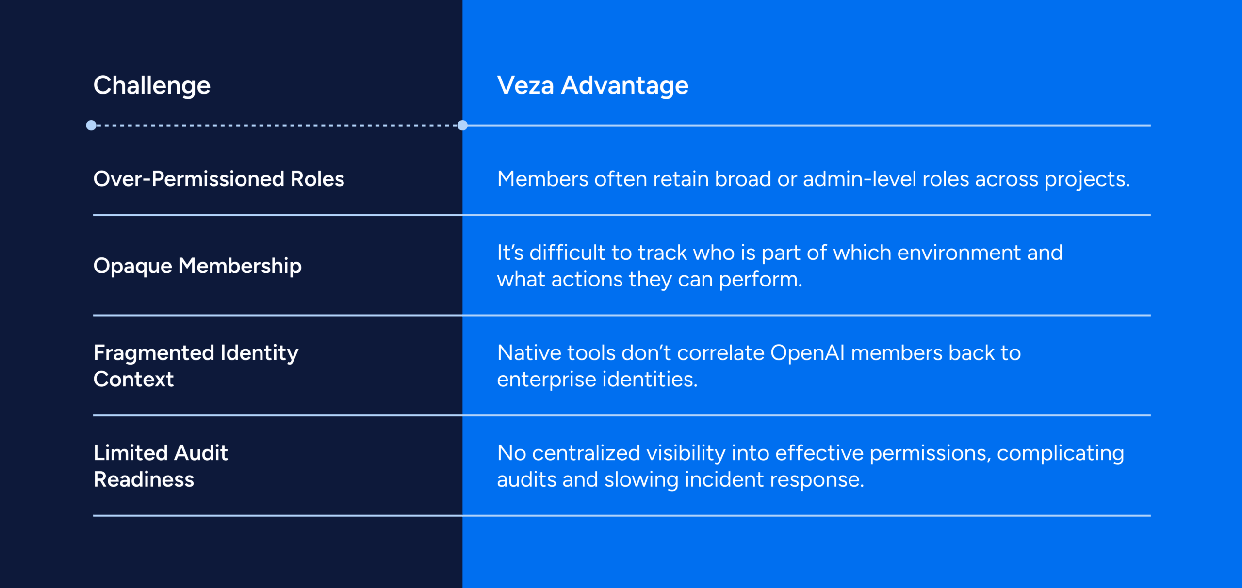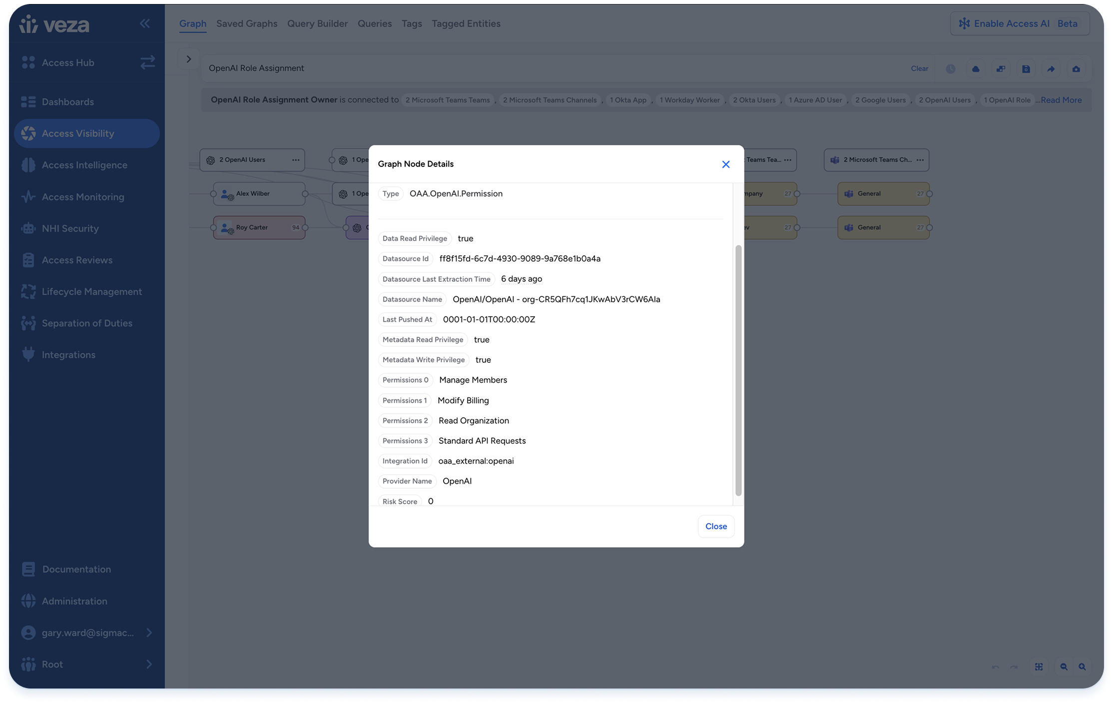 Veza integrates directly with OpenAI to deliver fine-grained access visibility. By mapping members and roles into Veza’s Access Graph, organizations can discover who has access to what and why. Security and identity teams can enforce least privilege, detect excessive permissions, and maintain audit readiness with confidence.