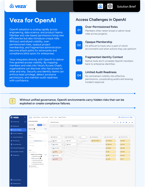 Veza integrates directly with OpenAI to deliver fine-grained access visibility. By mapping members and roles into Veza’s Access Graph, organizations can discover who has access to what and why. Security and identity teams can enforce least privilege, detect excessive permissions, and maintain audit readiness with confidence.