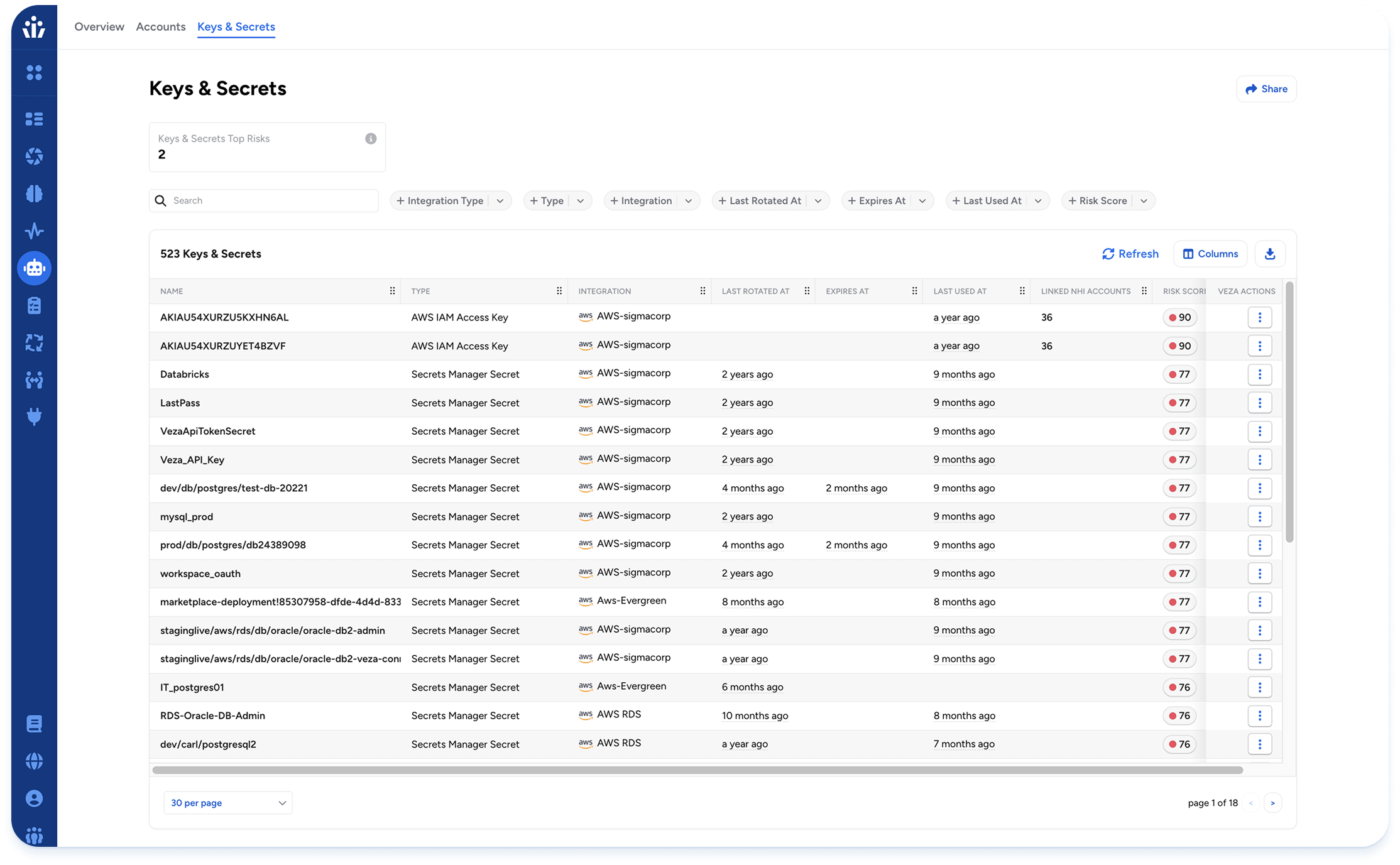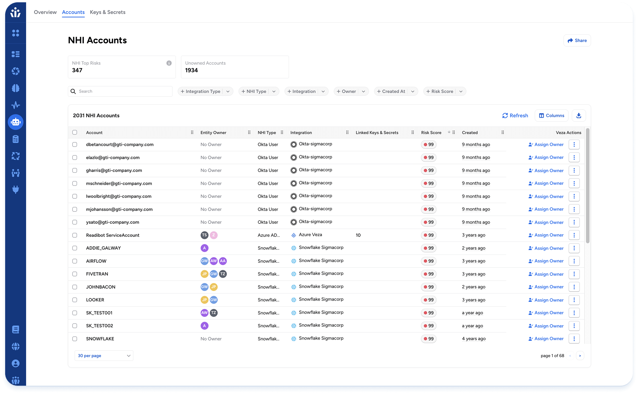 Gain full visibility and control over your Non-Human Identities (NHIs) with Veza. Create a complete inventory of service accounts, keys, and secrets. Assign ownership to drive governance and remediation. Detect expired credentials and over-permissioned accounts to reduce risk. Secure your NHIs and human identities together on a single, unified platform.