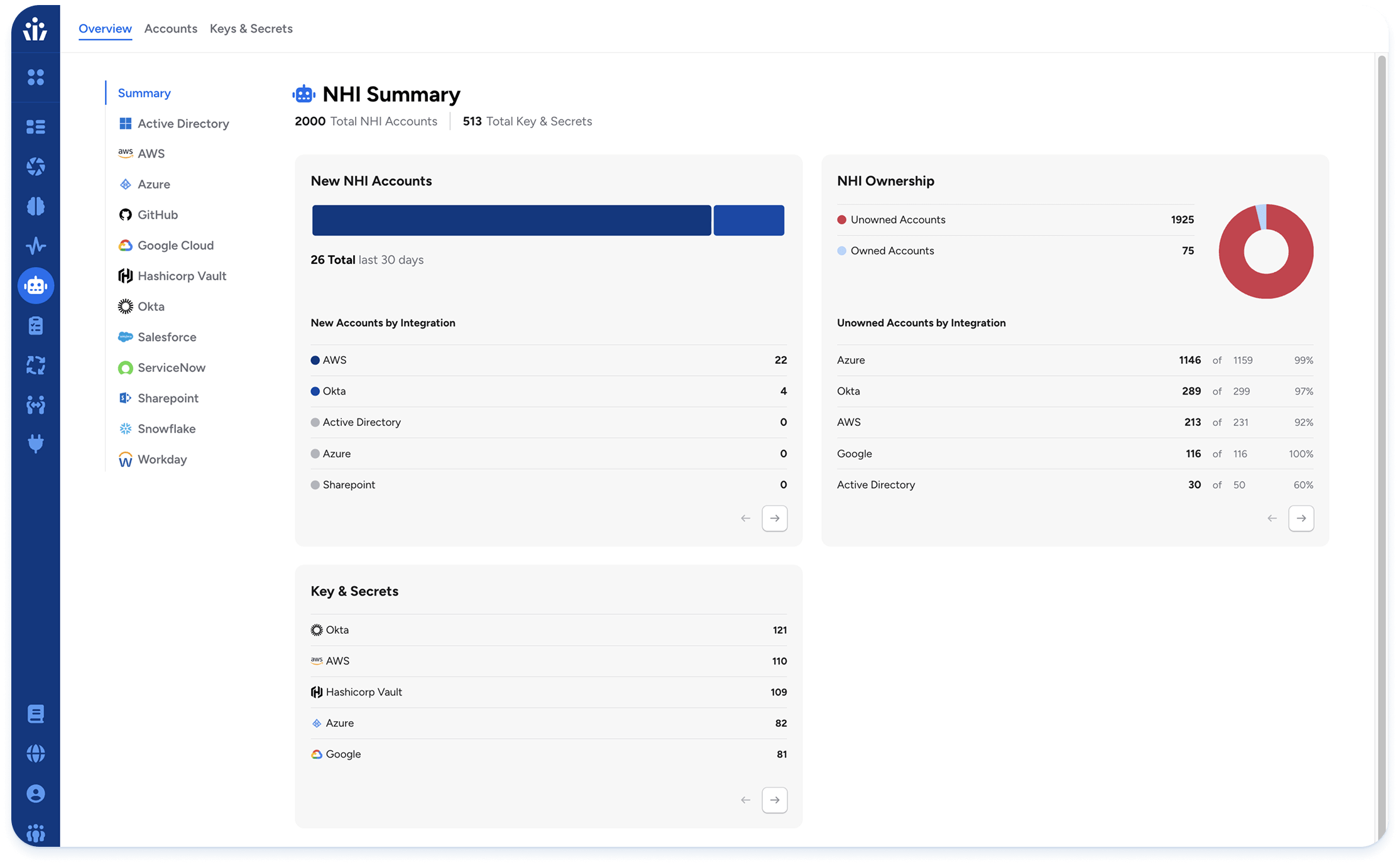 - Discovery & Inventory: Find and track NHIs like AWS Lambdas, Databricks service principals, Azure AD enterprise apps, Github deploy keys, and local accounts using out-of-the-box rules from 40+ integrations across SaaS, cloud, on-prem, and custom apps.