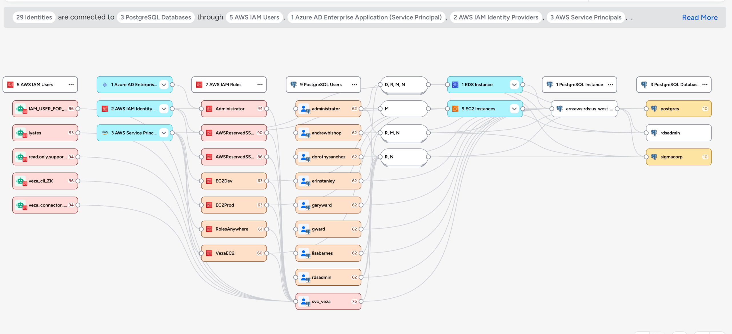Using our industry-leading Access Graph, Veza remains the only identity solution capable of quantifying the exact action-level blast radius for every AI agent, including the sensitive data and system resources impacted. For example, during incident response, security teams can instantly visualize every data store, S3 bucket, GitHub repo or database table a malicious/compromised AI agent identity can reach, enabling them to quickly identify and stop the lateral movement.