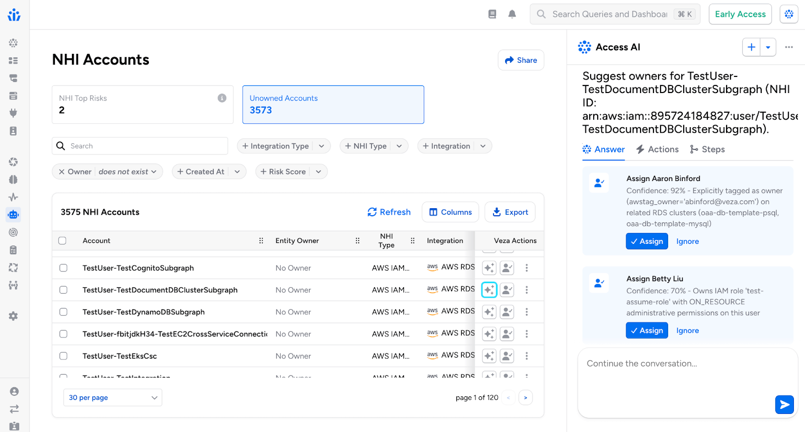 The Veza AI Agent Security provides deep visibility into every AI agent identity and establishes robust AI-agent-to-human ownership for accountability and governance. Veza now makes it easier to combat ‘shadow AI’ by automatically mapping unmanaged AI agent identities and NHIs to responsible human owners. When a developer spins up an AI agent with broad access permissions and later moves to a different department or role, Veza flags this orphaned agent identity and suggests possible human owners that can be mapped to this agent identity, tightening AI security posture and governance.