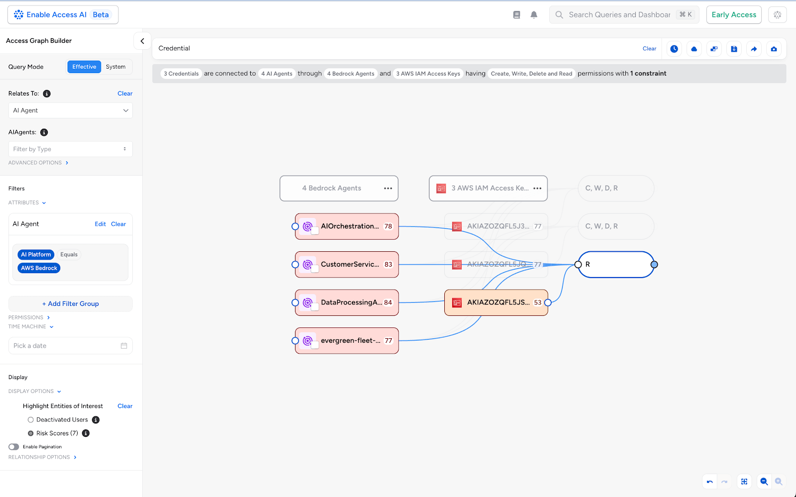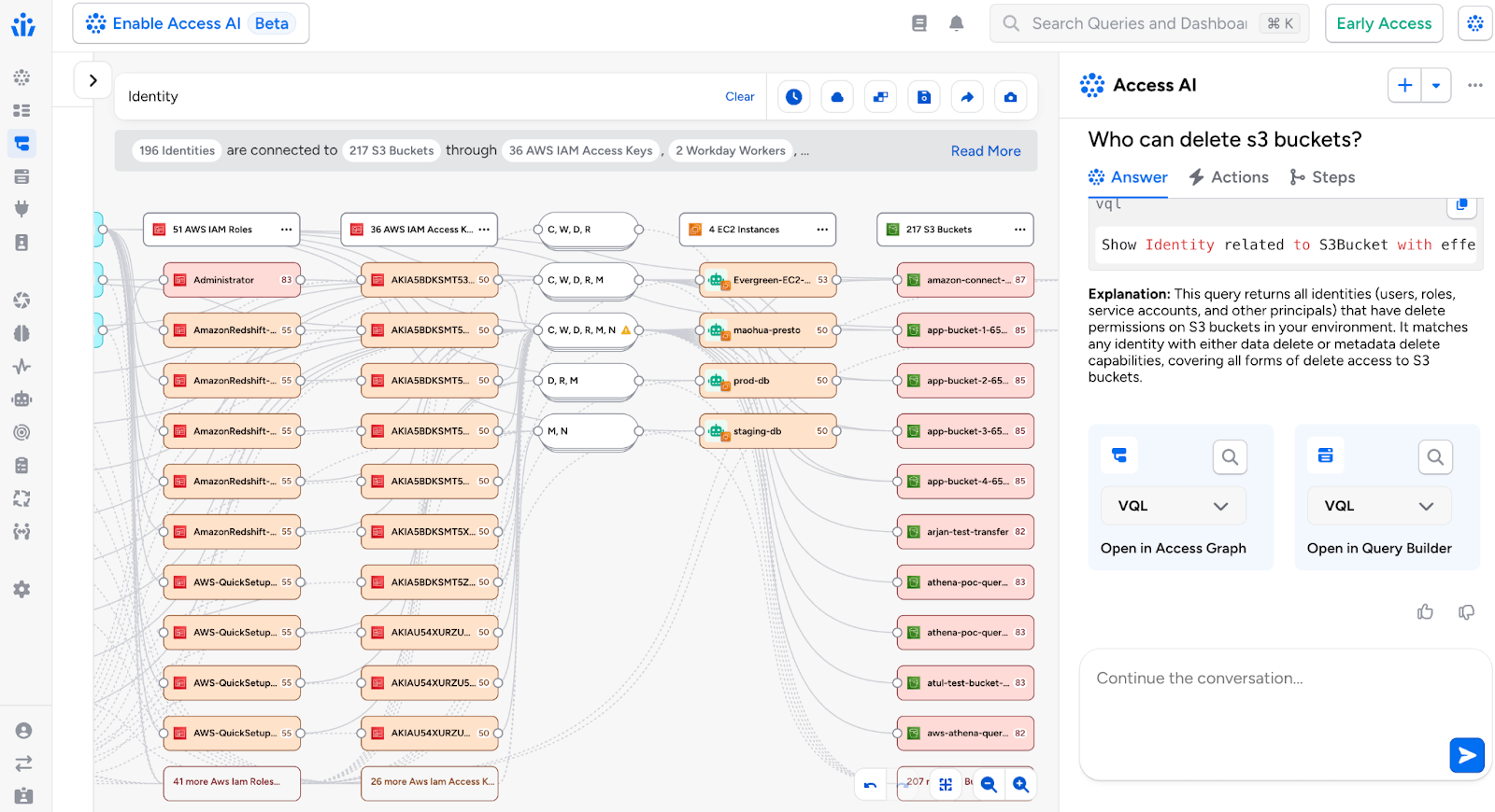 The Veza Access Search Agent takes the natural language prompts, applies deep reasoning, and dynamically visualizes complex permission relationships and entitlements for all identities. If a security engineer wants to know which identities have the potential to delete or modify S3 buckets, the Access Search Agent searches for risky access paths and entitlements across hybrid clouds and SaaS applications, and visualizes the blast radius in Access Graph. Veza gives the flexibility to visualize the information in Access Graph or Query Builder. In short, the Access Search Agent enables your security, compliance and IAM teams to visualize risky access paths to your data with simple prompts.